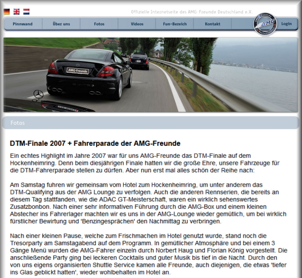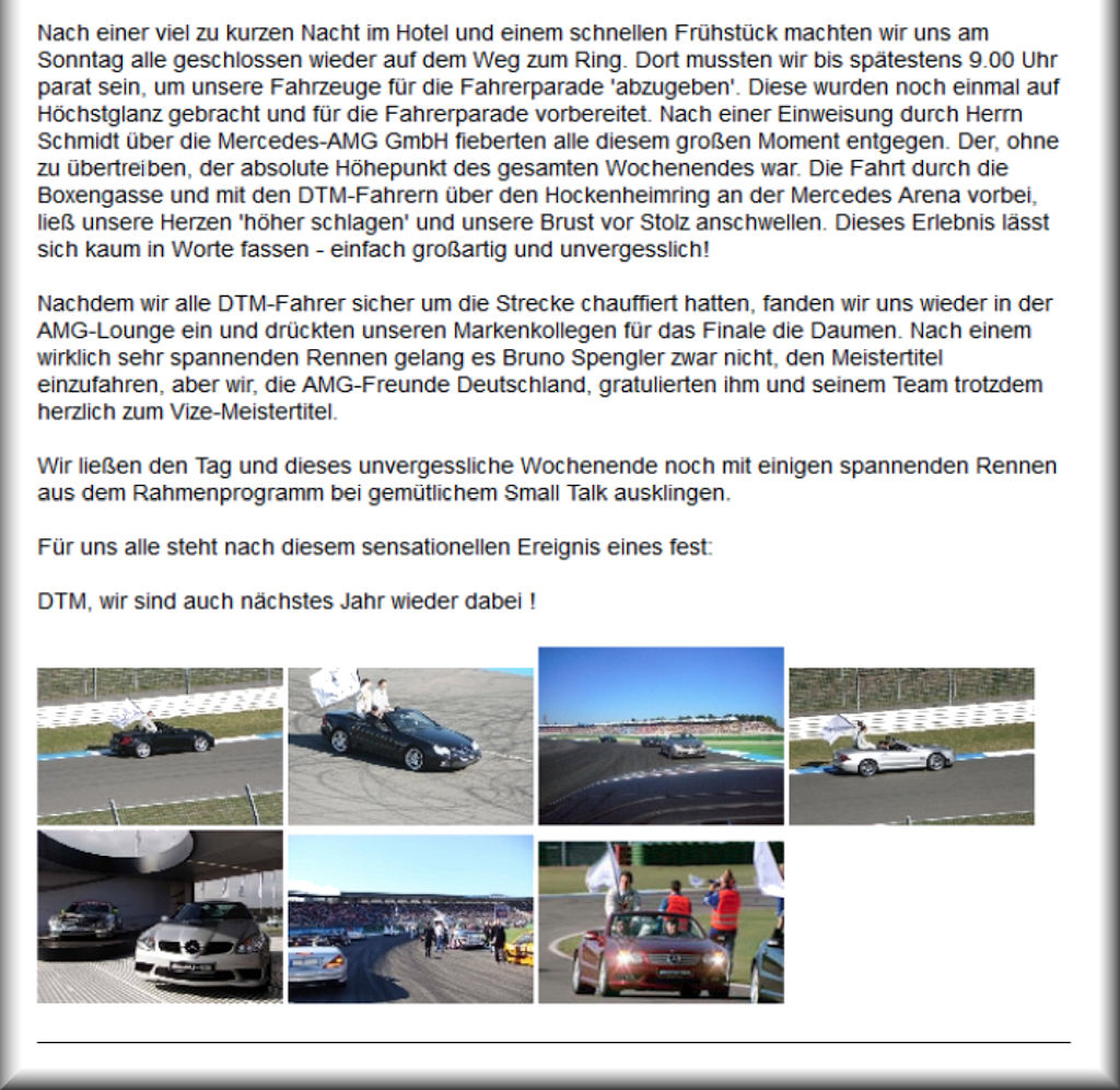 DTM-Finale 2007 + Fahrerparade der AMG-Freunde Ein echtes Highlight im Jahre 2007 war für uns AMG-Freunde das DTM-Finale auf dem Hockenheimring. Denn beim diesjährigen Finale hatten wir die große Ehre, unsere Fahrzeuge für die DTM-Fahrerparade stellen zu dürfen. Aber nun erst mal alles schön der Reihe nach: Am Samstag fuhren wir gemeinsam vom Hotel zum Hockenheimring, um unter anderem das DTM-Qualifying aus der AMG Lounge zu verfolgen. Auch die anderen Rennserien, die bereits an diesem Tag stattfanden, wie die ADAC GT-Meisterschaft, waren ein wirklich sehenswertes Zusatzbonbon. Nach einer sehr informativen Führung durch die AMG-Box und einem kleinen Abstecher ins Fahrerlager machten wir es uns in der AMG-Lounge wieder gemütlich, um bei wirklich fürstlicher Bewirtung und ‚Benzingesprächen‘ den Nachmittag zu verbringen. Nach einer kleinen Pause, welche zum Frischmachen im Hotel genutzt wurde, stand noch die Tresorparty am Samstagabend auf dem Programm. In gemütlicher Atmosphäre und bei einem 3 Gänge Menü wurden die AMG-Fahrer einzeln durch Norbert Haug und Florian König vorgestellt. Die anschließende Party ging bei leckeren Cocktails und guter Musik bis tief in die Nacht. Durch den von uns eigens organisierten Shuttle Service kamen alle Freunde, auch diejenigen, die etwas ‚tiefer ins Glas geblickt hatten‘, wieder wohlbehalten im Hotel an. Nach einer viel zu kurzen Nacht im Hotel und einem schnellen Frühstück machten wir uns am Sonntag alle geschlossen wieder auf dem Weg zum Ring. Dort mussten wir bis spätestens 9:00 Uhr parat sein, um unsere Fahrzeuge für die Fahrerparade ‚abzugeben‘. Diese wurden noch einmal auf Höchstglanz gebracht und für die Fahrerparade vorbereitet. Nach einer Einweisung durch Herrn Schmidt über die Mercedes-AMG GmbH fieberten alle diesem großen Moment entgegen. Der, ohne zu übertreiben, der absolute Höhepunkt des gesamten Wochenendes war. Die Fahrt durch die Boxengasse und mit den DTM-Fahrern über den Hockenheimring an der Mercedes Arena vorbei, ließ unsere Herzen ‚höher schlagen‘ und unsere Brust vor Stolz anschwellen. Dieses Erlebnis lässt sich kaum in Worte fassen – einfach großartig und unvergesslich! Nachdem wir alle DTM-Fahrer sicher um die Strecke chauffiert hatten, fanden wir uns wieder in der AMG-Lounge ein und drückten unseren Markenkollegen für das Finale die Daumen. Nach einem wirklich sehr spannenden Rennen gelang es Bruno Spengler zwar nicht, den Meistertitel einzufahren, aber wir, die AMG-Freunde Deutschland, gratulierten ihm und seinem Team trotzdem herzlich zum Vize-Meistertitel. Wir ließen den Tag und dieses unvergessliche Wochenende noch mit einigen spannenden Rennen aus dem Rahmenprogramm bei gemütlichem Small Talk ausklingen. Für uns alle steht nach diesem sensationellen Ereignis eines fest: DTM, wir sind auch nächstes Jahr wieder dabei !