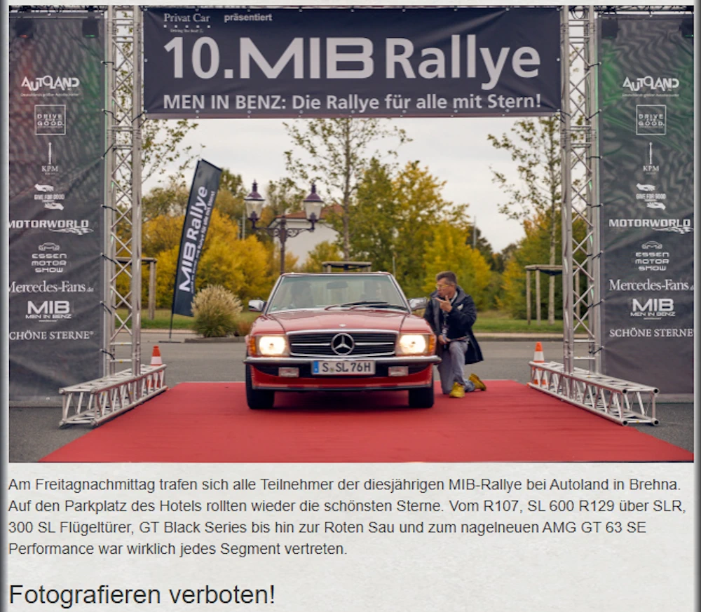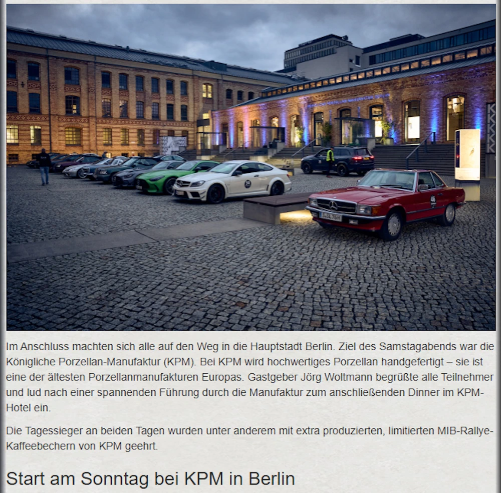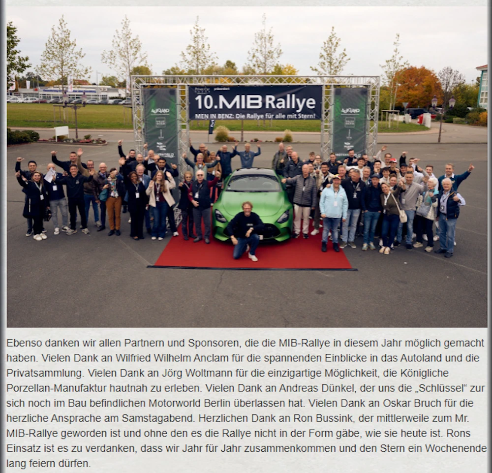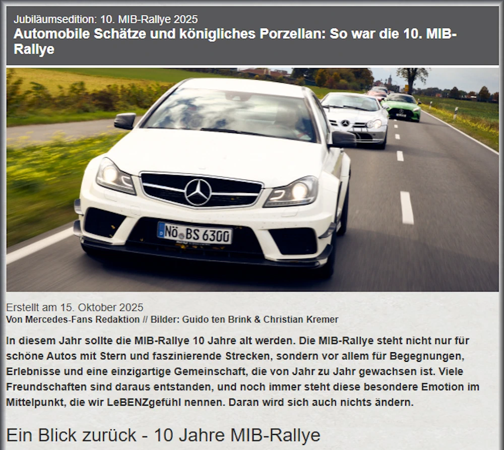 Jubiläumsedition: 10. MIB-Rallye 2025 Automobile Schätze und königliches Porzellan: So war die 10. MIB-Rallye Erstellt am 15. Oktober 2025 Von Mercedes-Fans Redaktion // Bilder: Guido ten Brink & Christian Kremer In diesem Jahr sollte die MIB-Rallye 10 Jahre alt werden. Die MIB-Rallye steht nicht nur für schöne Autos mit Stern und faszinierende Strecken, sondern vor allem für Begegnungen, Erlebnisse und eine einzigartige Gemeinschaft, die von Jahr zu Jahr gewachsen ist. Viele Freundschaften sind daraus entstanden, und noch immer steht diese besondere Emotion im Mittelpunkt, die wir LeBENZgefühl nennen. Daran wird sich auch nichts ändern. Ein Blick zurück – 10 Jahre MIB-Rallye Zahlreiche Persönlichkeiten wie Norbert Haug, Ellen Lohr, der unvergessene Jochen Maas, Klaus Ludwig, Clemens Schickentanz, Lance David Arnold und viele weitere haben der MIB-Rallye mit ihrer Leidenschaft für den Stern eine besondere Note verliehen. In den vergangenen Jahren führte uns die Rallye zu vielen beeindruckenden Stationen – vom DTM-Rennen in Hockenheim über Besuche bei Klassik-Experten wie HK Engineering und Mechatronik bis hin zur historischen Tankstelle in Wiesloch, wo Bertha Benz einst auf ihrer legendären Fahrt nachgetankt hat. Auch diesmal dürfen wir uns auf außergewöhnliche Partner freuen. Starke Partner Ein wesentlicher Teil der MIB-Rallye war stets die herzliche Gastfreundschaft unserer Partner. Besonders danken wir den Mercedes-Benz-Autohäusern Assenheimer, Mulfinger und Kunzmann für ihre großartige Unterstützung und das Gefühl, immer willkommen zu sein – ganz im Sinne unserer gemeinsamen Leidenschaft. Doch eine Rallye lebt vor allem von den Menschen, die sie mit Herzblut gestalten. Unser besonderer Dank gilt Ron Bussink, ohne dessen außergewöhnliches Engagement die MIB-Rallye, gerade in ihrer zehnten Ausgabe, nicht das wäre, was sie heute ist. Los gehts am Freitag im Autoland Brehna Am Freitagnachmittag trafen sich alle Teilnehmer der diesjährigen MIB-Rallye bei Autoland in Brehna. Auf den Parkplatz des Hotels rollten wieder die schönsten Sterne. Vom R107, SL 600 R129 über SLR, 300 SL Flügeltürer, GT Black Series bis hin zur Roten Sau und zum nagelneuen AMG GT 63 SE Performance war wirklich jedes Segment vertreten. Fotografieren verboten! Highlight des Freitagabends war die private Autosammlung von Autoland-Chef Wilfried Wilhelm Anclam, der mit „seinem“ Auto-Discounter pro Jahr fast 60.000 Autos verkauft, im Osten die Nummer 1 ist – und im Westen die Nummer 1 werden will. In zwei Gruppen ging es vom Hotel in eine unscheinbare Halle, und was sich dort befand, brachte selbst abgeklärte Kenner zum Staunen: zahlreiche Mercedes-Modelle – alle Fahrzeuge in nahezu perfektem Neuwagenzustand. Egal ob S-Klasse W116, W126, W140 oder W220 oder auch R107 und zahlreiche G-Klassen und Sondermodelle wie die „Stronger Than Diamonds“-Edition. Sogar Türen öffnen und Einsteigen war erlaubt. Da es sich um eine Privatsammlung handelt, war Fotografieren strengstens untersagt – wofür alle Teilnehmer vollstes Verständnis hatten. Nach diesem erhebenden Moment ging es für alle Teilnehmer zum Dinner. Start am Samstag in Brehna Der Startschuss fiel am Samstagmorgen. Mit den Eindrücken des letzten Abends machten sich alle Teilnehmer auf den Weg und passierten wunderschöne Strecken und Landschaften. Der Herbst tauchte die Bäume in farbenfrohe Kulissen, und das Wetter spielte wunderbar mit. Die Strecke führte durch das Tal der Elbe und war wunderschön. Zwischenstopp auf Burg Eisenhardt Die Mittagspause fand in Bad Belzig auf Burg Eisenhardt statt. Den MIB-Rallye-Teilnehmern war es erlaubt, auf dem Burgplatz zu parken – ein Bild für die Götter. Ankunft in der Königlichen Porzellan-Manufaktur Im Anschluss machten sich alle auf den Weg in die Hauptstadt Berlin. Ziel des Samstagabends war die Königliche Porzellan-Manufaktur (KPM). Bei KPM wird hochwertiges Porzellan handgefertigt – sie ist eine der ältesten Porzellanmanufakturen Europas. Gastgeber Jörg Woltmann begrüßte alle Teilnehmer und lud nach einer spannenden Führung durch die Manufaktur zum anschließenden Dinner im KPM-Hotel ein. Die Tagessieger an beiden Tagen wurden unter anderem mit extra produzierten, limitierten MIB-Rallye-Kaffeebechern von KPM geehrt. Start am Sonntag bei KPM in Berlin Am Sonntag stand dann die letzte Etappe der MIB-Rallye an. Gegen Mittag und nach einer traumhaften Fahrt durch die Berliner Wälder – AVUS, Siegessäule, Brandenburger Tor und die berühmt-berüchtigte Glieniker Brücke lagen ebenfalls auf der Route – kehrten alle Teilnehmer bei der sich noch im Bau befindlichen Motorworld ein. Nach einer Stärkung mit original Berliner Currywurst von Curry36 fand dort die Siegerehrung statt. Siegerehrung in der Motorworld Sieger der diesjährigen Rallye ist das Team 27, Nick Friedrich und Lasse Doepner auf SLK 200 Kompressor.. Platz ging an die Startnummer 16, Daniel Wirges und Leif Silas Tabel auf SL 600. Platz 3 belegte das Team 15, Ralf Kiefer und Eugen Huck mit einem SLS AMG Coupé. Gerne möchten wir uns in diesem Jahr ganz besonders bei allen bedanken, die die Rallye möglich gemacht haben – in erster Linie bei allen Teilnehmern, die uns bei der 10. Jubiläums-Edition begleitet haben. Ihr wart wieder einmal ein großartiges Starterfeld. Ganz besonders bedanken wollen wir uns in diesem Jahr beim Team Milas auf SL 55 AMG. Team Milas ist nämlich bereits zum 10. Mal dabei gewesen und hat keine einzige Ausgabe der MIB-Rallye verpasst – sagenhaft! Ein großes DANKESCHÖN an alle! Ebenso danken wir allen Partnern und Sponsoren, die die MIB-Rallye in diesem Jahr möglich gemacht haben. Vielen Dank an Wilfried Wilhelm Anclam für die spannenden Einblicke in das Autoland und die Privatsammlung. Vielen Dank an Jörg Woltmann für die einzigartige Möglichkeit, die Königliche Porzellan-Manufaktur hautnah zu erleben. Vielen Dank an Andreas Dünkel, der uns die „Schlüssel“